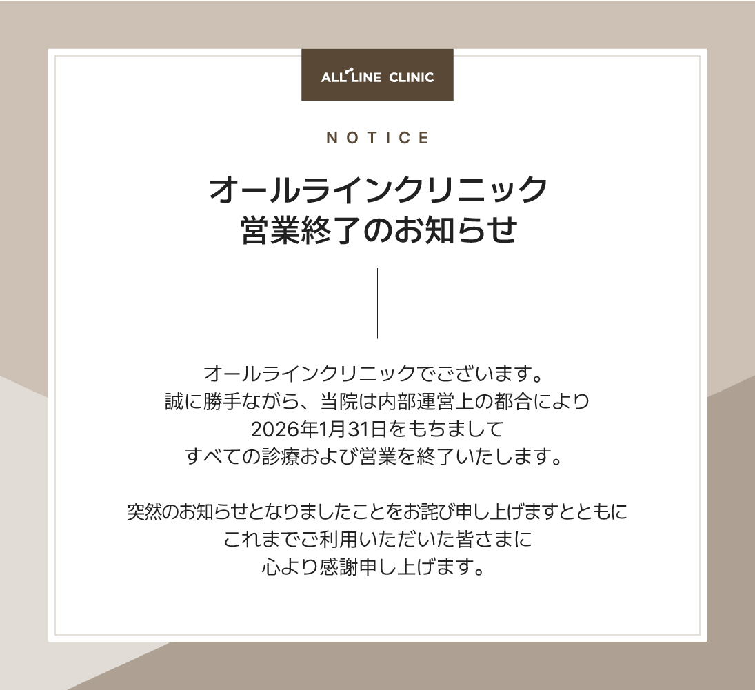 ![]() こんにちは。オールラインクリニックでございます。 平素より当院をご利用いただき、誠にありがとうございます。 誠に勝手ながら、内部運営上の事情により、2026年1月31日(土)をもちまして、当院はすべての診療および運営を終了することとなりました。 1.未使用チケット・残額前払い金の返金について ■受付期間: 2026月 1月 31日(土)まで ■ 受付方法: Googleフォームより申請 https://forms.gle/xhenDHTGvcGhZ4zU7 ■ 必要書類: ご本人確認書類(身分証明書等) * 代理申請の場合、委任状などの追加書類が必要となる場合がございます。(詳細は公式LINEにてご案内いたします。) ■ 返金処理時期 : 2026年2月上旬より、受付順に順次返金・お振込み予定 2. 診療記録の保管および写しの発行について ■ 院内での発行対応期間: 営業終了後も、2026年2月13日(金)までは当院にて診療記録の写しを直接発行が可能となります。 ■ 必要書類: - ご本人申請の場合 : 身分証明書 (状況により追加書類をご提出いただく場合がございます。) - 2月13日以降の保管・発行について: 2月13日以降には医療法に基づき、診療記録は電子記録として保管されます。 - 廃業後の発行方法について: 管轄の保健所を通じて本人確認手続きを行った上で、診療記録の交付を受けることが可能です。 発行時には身分証明書が必要となり、代理申請の場合は委任状等の追加書類が必要となる場合がございます。 3. 関連のお問い合わせについて ■ 公式LINE [@all_linejp] ※お問い合わせが集中することが予想されるため、すぐにご返信が難しい場合がございます。 恐れ入りますが、公式LINEまでメッセージをお送りいただけましたら、順次ご返信させていただきますので ご理解の程何卒よろしくお願い申し上げます。 最後までお客様にご不便をおかけすることのないよう、誠心誠意対応してまいります。 |